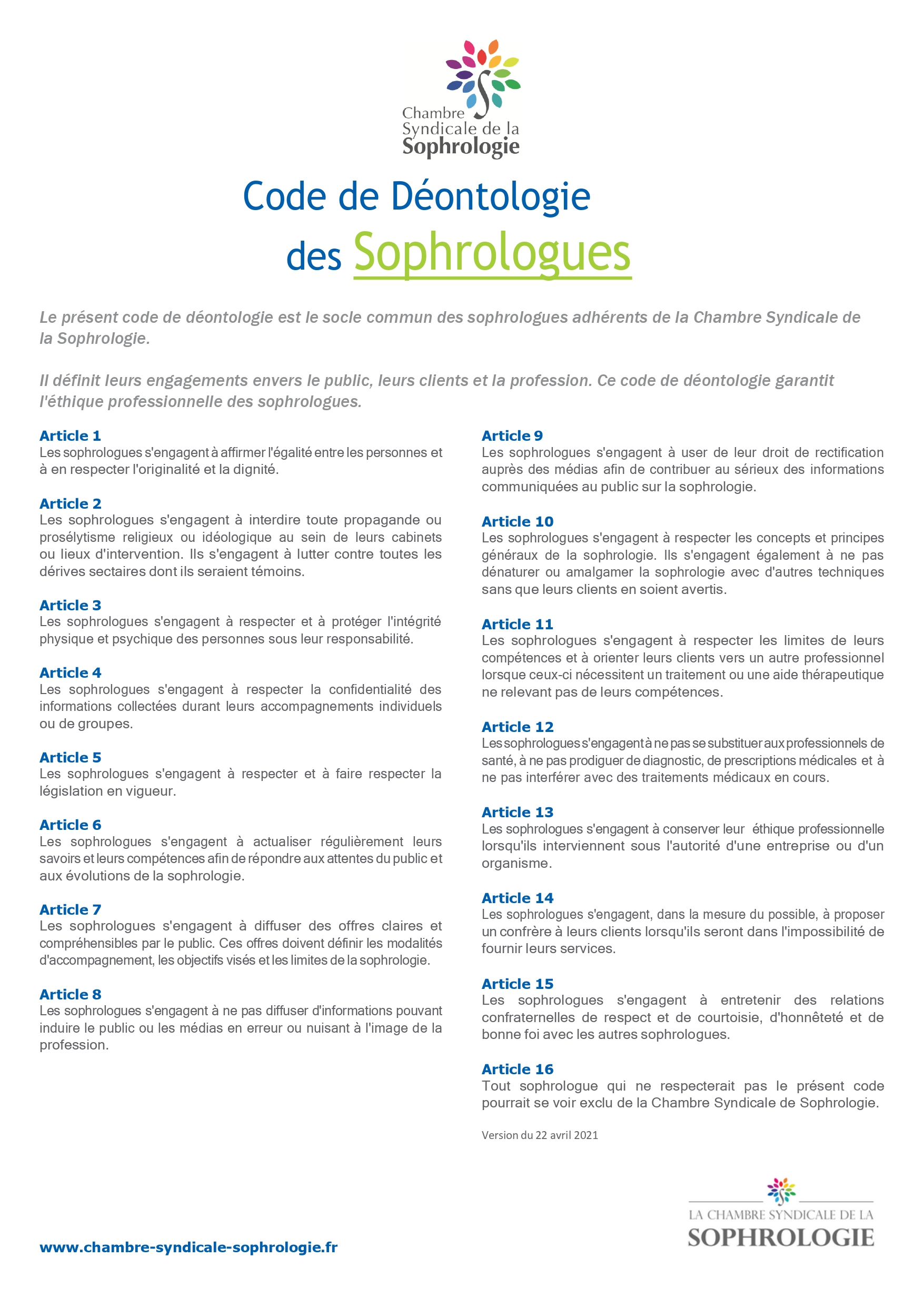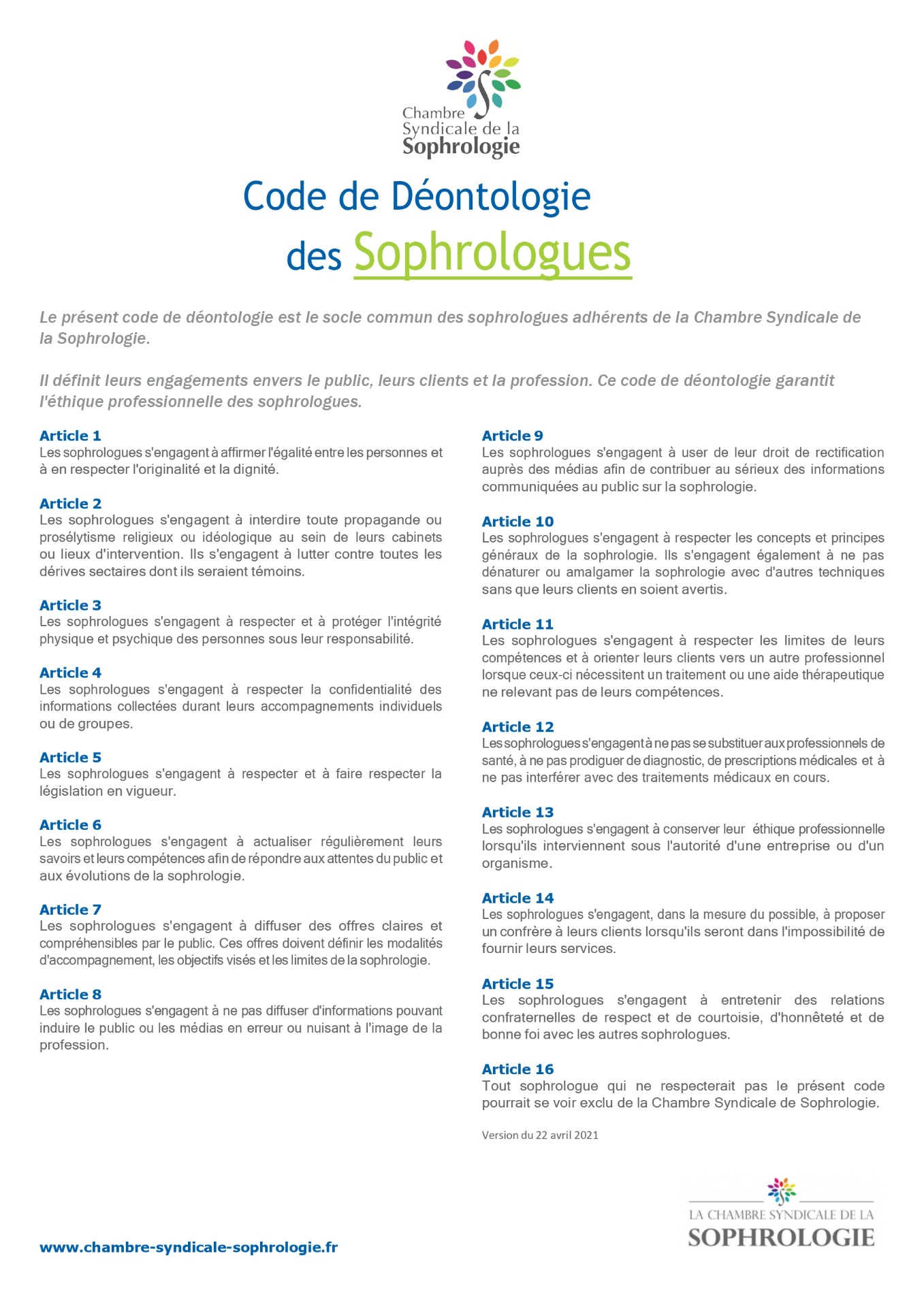 Il existe par ailleurs "un code de déontologie de la profession de sophrologue", édité par la chambre syndicale de la sophrologie.